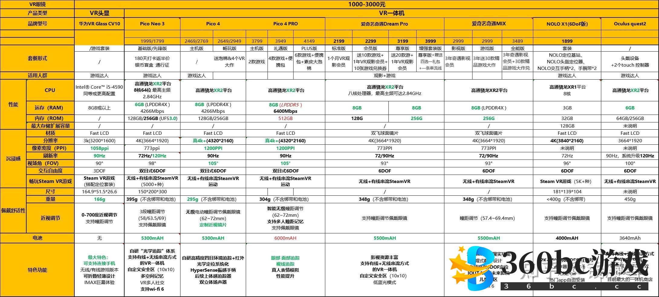 看到“眼镜”这个词大家最先想到的一定是近视眼镜、老花眼镜、墨镜等,但除此之外,还有一个就是如今风靡一时的VR眼镜。 随着科技的发展,现如今市场上的VR眼镜琳琅满目,对于一直想入手的朋友来说,选一款好的VR眼镜还是有一定难度的,下面我将从几个方面分析,教大家如何去购买一款物美价廉的VR眼镜。 通读全文,你会了解以下内容: 一、VR眼镜的常见问题 (1)VR眼镜值得买吗? (2)VR眼镜有哪些产品类型 (3)纱窗效应到底是什么? (4)VR眼镜伤眼睛吗? 二、VR眼镜哪个牌子好 三、VR眼镜选购技巧(划重点) (1)看品牌 (2)选类型 (3)沉浸感 (4)舒适性 四、高性价比VR眼镜推荐 (1)1000元以内品牌型号推荐 (VR手机盒子) (2)1000-3000元品牌型号推荐 (头显/VR一体机) (3)3000-5000元品牌型号推荐 (VR一体机) (4)5000元以上品牌型号推荐 (头显/VR一体机) 五、总结 本文篇幅较长,干货满满。懒人模式还是有必要开启下的,简单粗暴先推荐2款高分选手,各方面表现性价比高,供懒人快速作参考,适合VR游戏以及高需求观影体验。当然,还是希望大家可以通篇看完本文,后面也详细放上了每一款型号的参数图,大家可以自行比对,选出自己满意的型号。 AR眼镜中最推荐的一款: 依托TCL华星光电的雷鸟,显示技术全面领先,22年AR眼镜主流电商平台市场份额位居首位。其23年新品雷鸟Air2,无论在画质、佩戴舒适度、游戏性、音质、生态上(雷鸟魔盒)在AR眼镜行业里都极具竞争力。相较于VR眼镜完全虚拟的秘密空间,其最大的优势就是方便携带,室内室外都能使用,⽆论在家⾥还是在旅途出差/通勤/换乘,主打随时随地,观影、游戏体验极佳,可玩性强。 综合实力(观影+游戏)都在线: PICO再出新品,PICO 4 Pro在爆品PICO 4 基础上再升级,享受头手双6 DOF交互,新增同价位没有的视觉追踪新体验,硬件性能大升级,玩法多元化,兼具性价比的同时,极大提升影音、游戏玩家体验。 游戏发烧友: HTC VIVE Pro 2 2.0,PC VR的极致 2.0定位系统,目前业内最精准的定位方案! 下面是文章修改日志: 好了,话不多说,进入正题 事实上很多人第一次知道VR眼镜这个东西,一般都是从新闻上或一些短视频中,但很少有人知道它到底是什么,干什么用的。 VR即虚拟现实,人们在佩戴VR眼镜时,它会封闭人们对外界的视觉和听觉,从而引导人们进入一种虚拟的环境中,让人产生一种身临其境的感觉。 ![]() 很多人认为虚拟现实技术非常的高大上,VR眼镜可能不需要购买。我认为这种观点其实是不对的,其实现在的VR眼镜在许多功能上已经变得非常亲民,是非常值得大家购买的。 1、VR眼镜看影片 在家看电影就可以让自己达到置身于现实影院中的效果,提升观影感受 2、VR眼镜玩游戏 对于游戏爱好者来说,虚拟现实游戏更受大家欢迎,其游戏的体验感也更真实。 3、VR眼镜虚拟旅游 VR技术可以带你畅游数以千计的纪念碑、博物馆等热门的旅游景点,可以让你足不出户,欣赏美景。 4、VR眼镜虚拟汽车展厅 汽车爱好者可以通过该技术近距离观看不同汽车的外饰,内饰甚至可以听到汽车的引擎声音,给人们带来一种真实的试驾体验。 1、手机盒子 这类眼镜的成本非常低,因为它本身只提供了一个凸透镜的功能。其处理器、显示器、陀螺仪都来源于用户的手机,并且存在手机适配的问题,所以也叫作嵌入机。 这类VR眼镜属于体验级别的产品。价格不高,百来块。你所看的画面的好坏几乎完全取决于你自己手机的好坏。一些高端的手机盒子会配备额外的陀螺仪和手柄控制器来提升用户体验。 ![]() 2、VR一体机 一体机,顾名思义就是将处理器、显示器、透镜和陀螺仪集成到一起的VR眼镜,不需要手机和PC等外部设备的连接,没有了连接线的枷锁,你可以尽情享受移动的自由,不论是室内还是户外,即开即用非常方便。 ![]() 3、头戴显示器(头显/PCVR) 头显自身配备了显示器和陀螺仪,所以其成本要远高于手机盒子。使用它时对于电脑或手机的配置也是有一定要求的,通过CPU和显卡来计算,才可以达到相当不错的显示效果。与此同时,因为需要外接处理器,所以其携带起来就没有那么方便了。当然,如果头显能够连接手机,手机携带还是相当方便的。 ![]() 纱窗效应就是由于VR眼镜的屏幕和内容的像素不高,导致人眼会直接看到显示屏的像素点,画面像是打了马赛克一样。一种站在纱窗后看前方的即视感,纱窗效应由此而来。纱窗效应直接影响真实的体验。 ![]() 那目前主流的VR眼镜到底有没有纱窗效应呢?答案是,有。这是VR眼镜里通用的技术瓶颈。如果有哪个产品说自己没有纱窗效应,那一定是骗人的。大家都有,就看谁的纱窗效应更小了。 那么如何降低VR眼镜固有的纱窗效应呢? 1、视频以及屏幕的像素清晰度要提高。 如果要达到骗过人眼的效果,VR眼镜显示屏的像素分辨率至少要达到目前主流产品的数倍以上。 2、刷新率提升,减少延迟和拖影现象。 目前市面上主流的VR眼镜已经能做到90Hz的刷新率,解决了过去佩戴晕眩的状况;还有个别型号能达到120Hz,但也只能算是流畅。有数据表明,如果想要拥有足够真实的体验,刷新率能要达到150-240Hz以上才能实现。 3、也能通过LCD面板减少像素之间的距离等方式降低 有实验表明,佩戴VR眼镜对眼镜造成的伤害可能都没有成日把玩电子产品来的大。WHY? 原因就在于VR眼镜内部是透镜原理设计,你以为的人眼看到的近距离的VR屏幕,其实是几米几百米距