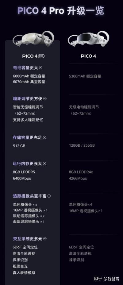 ③便利性升级:PICO 4 Pro版升级智能无级瞳距调节,支持PICO 4没有的多人瞳距记忆功能,也就意味着家里人轮番玩不需要重新调节,便利很多,这也是细致的地方。 其他具体升级点,看下面对比图即可。 ![]() 我的建议: