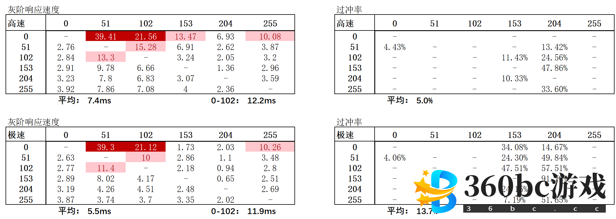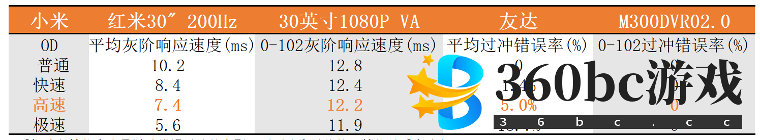 小米Redmi发布了一款30英寸曲面带鱼屏显示器(下问简称“Redmi 30”),200Hz刷新率,VA面板,2560 x 1080分辨率,1800R曲率。 Redmi 30的首发价1299元,价格极具吸引力。但目前是1499元,就不太Redmi 30并不是一些网友理解的“超大屏显示器”。实际上,30"(英寸)带鱼屏并不大,它适合办公室或者学校宿舍使用,30英寸其实就是把23.8英寸的屏幕加宽,比常见的34英寸带鱼屏要小很多。30”屏幕的显示区域大概是69cm*29cm;而34”大概是80cm*33cm,面积上比30”屏幕大30%,如果再考虑边框支架,肉眼看起来34”可能比30”大40%。 工程模式显示面板为友达M300DVR02.0[1],这个面板的屏库网参数可能有误,屏库网说是1500R曲率,实际是1800R。 (工程模式进入方法:关闭显示器后,按住菜单键10秒,然后菜单键和开机键一起按,等显示器亮起后松开,完全开启后再按菜单键,会发现一个F字母,选择F即可进入) ![]() 作为VA,响应速度必然非常捉急。但是,小米又是业界响应速度调教做的最好的厂家之一,小米是否能拯救这块VA面板呢?答案是: 我可以看出小米确实尽了最大努力,但是这块版面依然是“给你机会你不中用啊”。 ——为什么说小米是业界响应速度调教最好的厂家之一?难道AOC/三星等大厂技术不如小米吗? 显然不是。在显示器研发/制造技术方面,AOC/三星比小米强了起码好几个档次。但是这些大品牌对于中低端产品的态度和重视程度远不如小米。大厂对2000元以下的显示器完全不上心,无论是色彩还是响应速度调教方面都非常敷衍。这导致:AOC/三星等大厂的中低端显示器在性价比/做工/色彩/速度等方面被小米/雷神这样的三线品牌全面吊打。而在售后方面,如果都是京东买,那就连售后差异也没有了。 正面没有亮点,中规中矩。不知为何,我总觉得这种支架底座很难看。 ![]() 虽然是小号的带鱼屏,但也非常适合看电影、办公和游戏。屏幕足够宽,所以可以同时放下电影和游戏窗口,我喜欢带鱼屏就是因为我常常一半屏幕刷B站、另一半玩炉石,或者一半放Word写鲁汶、另一半放相关文献。 此外,Redmi 30也和其他带鱼屏一样,支持分屏操作。 ![]() 背面和正面不同,颜值逆天,丝滑细腻的喷漆材质,搭配完美的曲面外壳,设计、做工、配色上都在毫无违和地彰显着高级感。Redmi 30的背面绝对可以媲美高端显示器。 ![]() 看这质感,这光泽,我愿称其为“背影杀手”。 好看并不代表好用,铁憨憨支架*不支持*升降。 ![]() 接口做得也非常漂亮,同样是喷漆工艺,质感和触感都极好。 好看并不代表好用X2,*没有*OSD摇杆! ![]() 接口是DP1.2 x2+HDMI 2.0+耳机,HDMI口只能2560x1080 180Hz 8bit,DP口可以2560x1080 200Hz 8bit。 0-100%亮度都是DC调光,不闪屏 原生8bit,不支持抖10bit。 控制面板中可以设置2560x1080 165Hz 10bit,这只表示显卡能对其输入10bit图像,但实际上显示器依然只会输出8bit图像,说明它无法抖10bit。 ![]() 100% sRGB + 96% DCI P3,如此好的色域表现,在入门级显示器中,算是一股清流。 然而,不支持色域切换,以及DCI P3覆盖率如此高,那就必然有无法解决的过饱和问题。 没有色域切换着实令人痛心,我一直认为小米显示器最大的特色就是色彩和响应速度,其中,色彩方面就是高色域外加优秀的色域切换功能。Redmi 30砍掉了我很看重的色域切换。我已经习惯过饱和,并不会在意色域切换功能,但是很多用户不喜欢过饱和,他们可能会一时难以适应。 ![]() 最大亮度294nit,因为是VA面板,对比度很高,接近4000。高对比度是VA为数不多的优势。对比度越高,意味着黑色显示效果越好,用它来看电影、玩一些大型单机游戏会很不错,遇到黑夜场景,显示效果远超IPS显示器! ![]() 均匀性表现较好,有中高端游戏显示器的水平了。可能因为面板本身素质比较高。 ![]() 不太好,2.59的偏差均值,只能说是“肉眼看不出问题”,但是实际上比优秀的游戏显示器而言还是差远了。 ![]() 颜色比较艳丽,色温略微偏暖色,看起来还行,不过肯定说不上“特别好”。只能欺负欺负同价位的选手。 ![]() ![]() 因为对比度高,黑色显示效果极好。 ![]() 1080P 120Hz 4.6ms,正常水平 原生200Hz 最佳OD档位为「高速」档,响应速度7.4/12.2ms[2]。该调节选项在OSD菜单-画质-灰阶响应时间中。 ![]() 经常看我文章的人可能会觉得很奇怪,平均响应速度和0-102灰阶的响应速度不应该差不多吗?为什么这次差距这么大? 要回答这个问题,需要先看一下详细的灰阶响应速度图。如图所示,Redmi 30大部分灰阶的响应时间都很短(小于3ms),但是从纯黑(0灰阶)出发,到灰色(介于0和255灰阶之间)或者白色(255灰阶)的响应时间都很长。 以高速档为例,0→51甚至达到了39ms,0→102也有21ms。这使得整体平均响应时间被拉高,而0—102的这一组灰阶的响应时间(21.56/2+2.84/2=12.2ms)被拉得更高。 ![]() PS:从高速到极速档,部分灰阶的响应速度降低了,比如0→153 (从13.47ms降低到1.73ms)、0→204(从6.93ms降低到2.03ms),这是因为在极速档下,这些灰阶组合被施加了更多的电压,加压使得液晶分子运动加快了。但是过度加压也带来了图像错误,这两个档位的过冲错误率从0%/0%提高到了34.08%/14.67%,所有灰阶的平均过冲错误率从5.0%上升到13.7%,实际使用中,也会出现“鬼影”。一般认为,平均过冲错误率在10%以下才可以接受,超过10%则有图像错误而产生的“鬼影”,过冲率越高则“鬼影”越多。 那么,部分灰阶的响应时间太高(或者响应速度太慢)会有什么危害? 如果只是102-153这一组的