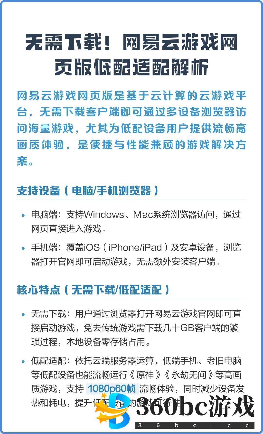 关注 无需下载!网易云游戏网页版低配适配解析 网易云游戏网页版靠云计算技术,让玩家不用下载客户端,多设备浏览器都能玩各种游戏。对低配设备用户特别友好,高画质游戏也能流畅跑,兼顾方便和性能。 支持设备(电脑/手机浏览器) 电脑端:Windows和Mac系统,浏览器打开就能直接玩,不用装其他东西。 手机端:iOS和安卓设备都支持,手机浏览器打开官网就能玩,不用装客户端。 无需下载:电脑或手机打开官网就能直接玩,省了下载几十GB客户端的麻烦,不占手机电脑存储。 低配适配:靠云端服务器算,低端手机和老电脑也能流畅玩《原神》《永劫无间》这些游戏,支持1080p60帧,设备发热和耗电都少,低配设备体验也好。 ![]() 0 0 《放逐之城》官方手机版上线|策略生存手游...全文