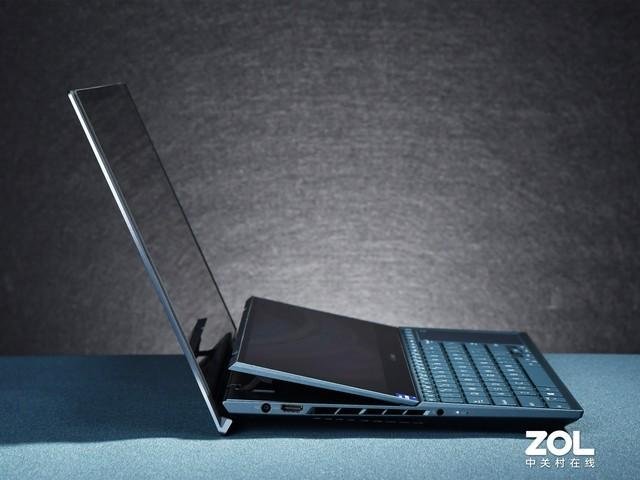 机身左侧配有电源插孔、标准的HDMI 2.1接口,以及1个3.5mm耳麦插孔。目前搭载HDMI 2.1接口的笔记本电脑还屈指可数,华硕灵耀X双屏Pro采用HDMI 2.1之后,带宽提升到48Gbps,可支持4K 120Hz和8K 60Hz视频传输,支持可变刷新率,并且支持动态HDR,完全可以满足专业用户的视频扩展需求。 华硕灵耀X双屏Pro的C面设计,解决了双屏笔记本没有物理键盘的痛点。双屏笔记本在行业里时有出现,但以往一些双屏本之所以没有办法延续下来,很重要的一个问题是物理键盘缺失导致交互效率降低,华硕灵耀X双屏Pro则没有这个问题。