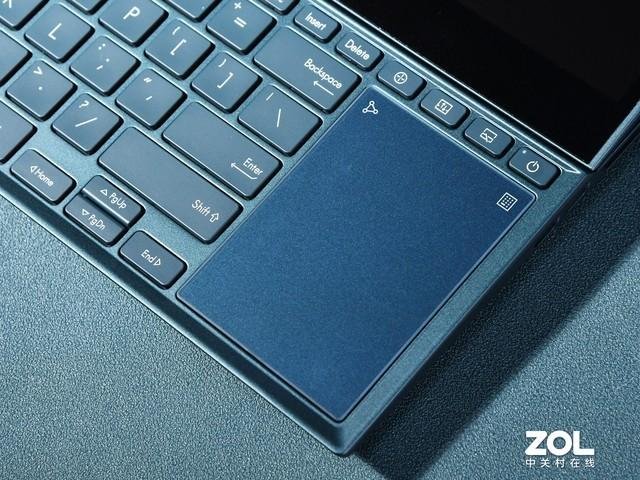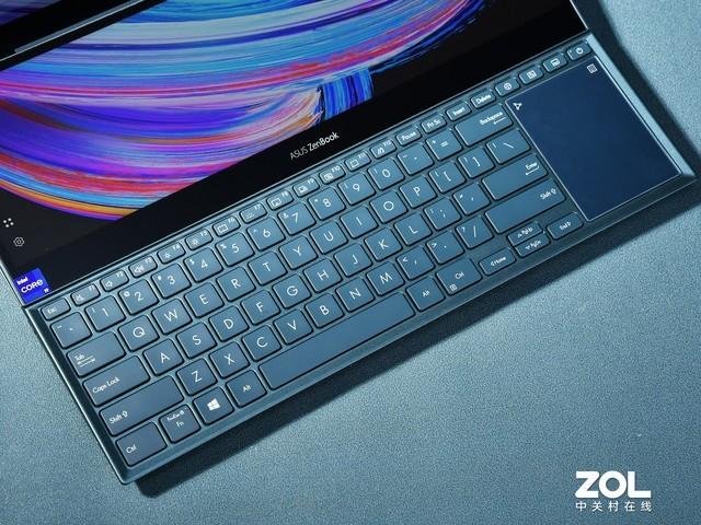 此外,NumberPad上方、电源键左侧的三个按键在实际使用中非常关键,最左侧的是性能模式切换键,可以在安静、平衡、高效三种模式中快速切换;左侧第二枚按键可以将主屏幕的应用快速移到副屏上;而它右侧的按键则是ScreenPad Plus的开关键。 在实际使用过程中,华硕灵耀X双屏Pro的键盘手感给笔者留下了非常好的印象,它采用了1.4mm键程,这种键程整体行程适中,所以手感非常舒适。而且它还兼顾了触发响应速度和弹力反馈,在打字输入、游戏操控等体验上都很不错。另外华硕灵耀X双屏Pro的键盘还支持三档背光调节,暗光环境下使用也不必为误触而担心。
