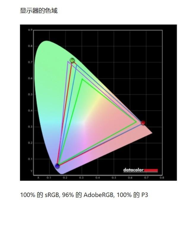 色域覆盖方面,这款产品主屏幕达到了100% sRGB色域,96% AdobeRGB色域,以及100% DCI-P3色域,宽广的色域覆盖范围可以让这块屏幕显示更加丰富的色彩。此外需要说明的是,这块屏幕在P3色域覆盖上达到100%的情况下,其sRGB实际色域覆盖要超出100%,只不过蜘蛛校色仪最高只能显示100%。