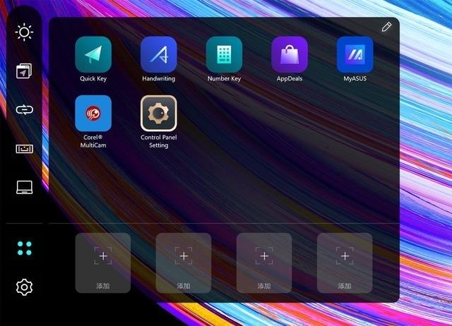 色准表现也是相当出色,平均ΔE=1.23,最大值也仅为2.83,最小值甚至只有0.19,说明其色彩偏离度极低,各项色彩显示精准,能够最大限度还原出色彩该有的样子。 实际观感方面,我觉得这块屏幕给人的感觉是非常艳丽,显示效果极佳。尤其是其支持HDR 500的情况下,我在这段时间里没少拿它看HDR视频,高动态对比度的效果真的是相当震撼。 ·不断进化的副屏体验 双屏设计最怕的就是让人觉得另外一块屏是多余的。华硕在改善双屏笔记本实用性方面一直在努力做到最好,所以这块副屏也是眼看着越来越实用。 首先我们能在副屏侧边任务栏上调出应用菜单,这里有一些预置的支持副屏的应用,同时还可以从APP商店下载一些对副屏进行支持的应用,整个生态是慢慢建立起来了。