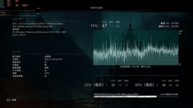 正如上方截图所示,笔者在游玩《赛博朋克2077》时,可以同时在副屏打开游戏攻略,遇到不会的地方可以直接查询,使用非常方便,省时省力。 除此之外,其实华硕灵耀X双屏Pro的这块副屏还有很多日常应用可以契合,比如多文档编辑、写代码、炒股等等。而且华硕灵耀X双屏Pro的主屏和副屏并不是完全割裂使用,尤其是双4K分辨率的配置,使得二者在内容显示方面更加丰富、更加细腻。 ·高性能配置Hold住4K游戏体验 华硕灵耀X双屏Pro拥有出色的硬件性能,虽然它更多的是面向专业用户打造,但如果不拿来玩游戏无疑是浪费了这么好的配置。而且11代酷睿i9-11900H+RTX 3080独显Hold住4K游戏也没有压力。