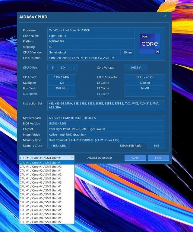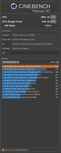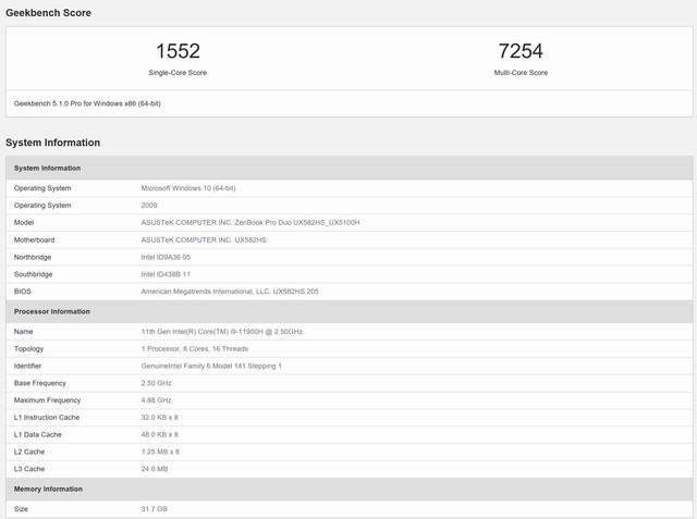 Geekbench 5通过各种科学计算、多核心计算等测试项目,对处理器单核和多核性能给出直观评分。在这一测试标准下,英特尔11代酷睿i9-11900H处理器单核得分1552,多核得分高达7254分,综合表现出色。