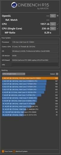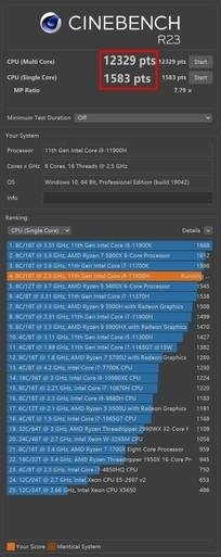 单核和多核渲染性能方面,在CINEBENCH测试标准中,实测Cinebench R15多核1957cb、单核236cb;Cinebench R20多核4801pts、单核604pts;Cinebench R23多核12329pts、单核1583pts。无论是多核还是单核,酷睿i9-11900H都拥有着相当不错的性能优势,特别是多核性能表现,在移动级处理器中表现优异。