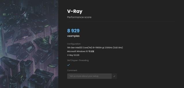 物理渲染方面,我们来看V-Ray Benchmark的测试结果。在该项测试标准下,实测性能评分达到8929vsamples,说明酷睿i9-11900H拥有非常高效的物理渲染能力。