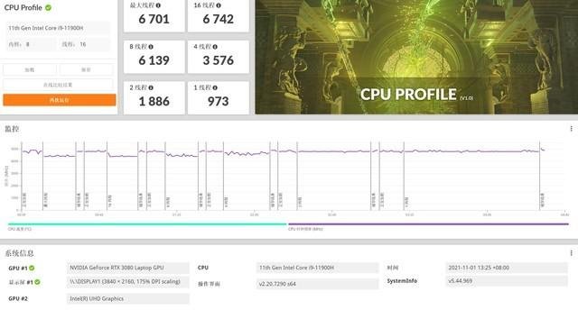 3DMark的CPU PROFILE可以对处理器进行单线程到多线程的全部测试,在这一测试标准下,英特尔11代酷睿i9-11900H处理器单线程得分高达973,2线程得分1886,4线程得分3576,8线程得分6139,16线程得分6742,最大线程数综合得分6701,这一测试结果在目前的移动级处理器中表现出众。 强大的处理器性能之外,华硕灵耀X双屏Pro也配备了RTX 3080独立显卡,其最大功率为110W,采用了Max-Q技术,毕竟这款机器的双屏设计要尽量避免高热量。