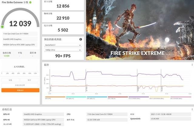 依然是最高画质,4K分辨率,平均帧数接近127fps,运行相当流畅。 总体来说,华硕灵耀X双屏Pro不仅能够胜任专业领域的视频、绘图、渲染等任务,同时也能满足普通用户的游戏需求,是一款无短板的全能水桶机。 ·综合性能表现优异 为良好体验奠定基础 最后按照惯例,还是来看看这款产品的整体性能表现究竟如何? 我拿到的这款机器配置了英特尔11代酷睿i9-11900H处理器、32GB DDR4内存、1TB PCIe 4.0 NVMe SSD以及NVIDIA GeForce RTX 3080 Laptop GPU,这套配置无疑是目前笔记本产品的高端配置,下面我们来看看实测情况。