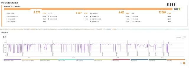最后的综合性能方面,我们使用PCMark 10 Extended模式对其进行了评估。从结果可以看到,华硕灵耀X双屏Pro在常用基本功能,包含Web浏览、视频会议、应用程序启动等得分为9373分,这个分数在目前的同类产品中表现不错;而在生产力项目测试中得分为8707分,说明其完成电子表格、文档工作没有压力;数位内容创作方面,NVIDIA GeForce RTX 3080 Laptop GPU为其提供了不错的图形能力,其评分达到9605分,说明其完成图片、视频、图形渲染等工作没有太大压力;游戏性能评分则达到了17069分,另外其综合得分为8388分,各项性能体验非常全面,没有明显短板。 ·散热性能评估 华硕灵耀X双屏Pro可以给到用户最佳的体验,但是双屏设计对于散热会有更高的要求,毕竟副屏下方就是主板区域,虽然采用了抬升式设计,但热量过高也会对其有所影响。那么这款产品的散热表现如何呢?接下来我们对其进行了满负载的CPU单烤机和CPU+GPU双烤机测试。