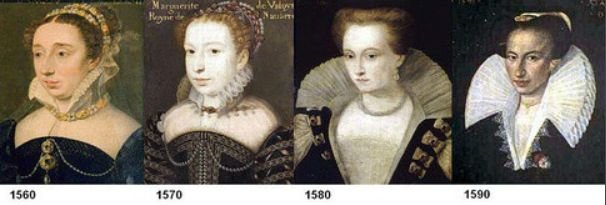 16世纪常见的切口装饰处理 《人类革命》中女性服装的设计则是文艺复兴时期服装风格未来化的重头戏,她们大都会采用名为“拉夫”的领部装饰,呈车轮状造型,周边是8字形连续的褶,外口边缘处用花边和雕绣作装饰。拉夫领的制作工艺十分复杂,需要特制的工具来完成造型,因此拉夫领也被当做贵族象征。