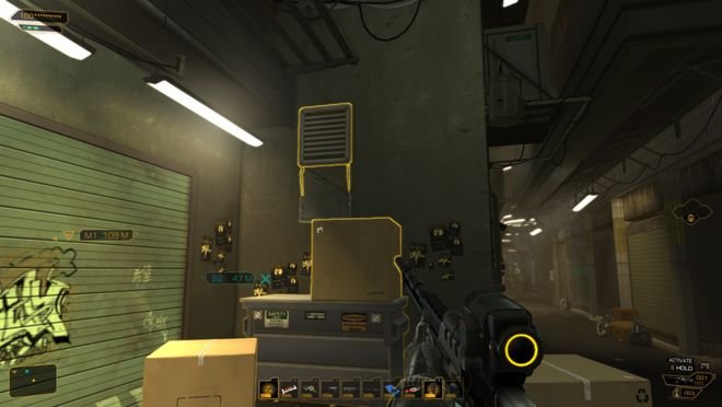亚当詹森可以在特定墙壁位置一击破墙实现突袭,或者绕过敌人,改变行动路线 游戏的场景并不大,但基本都经过设计,玩家攻略游戏的方式多种多样,你可以选择正面战斗,击杀敌人,然后堂而皇之地达成目的,或者利用场景要素,选择其他路线。比如游戏中需要玩家进入一栋建筑时,你可以选择: 给门口保安交1000块,让他们放行 干掉门口的保安,然后进去 绕到这栋建筑后方,钻通风口进去