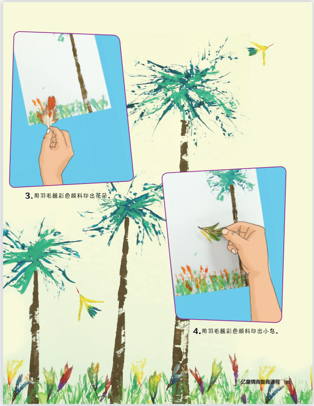 海边的椰树也可以用羽毛变出来,让我们一起来试试吧! 你需要准备: 羽毛、硬纸片、白纸、水粉颜料、盘子。 游戏步骤: 1.用羽毛蘸绿色颜料印出椰树叶。 2.用硬纸片蘸褐色颜料印出树干。 3.用羽毛蘸彩色颜料印出花朵。 4.用羽毛蘸彩色颜料印出小鸟。