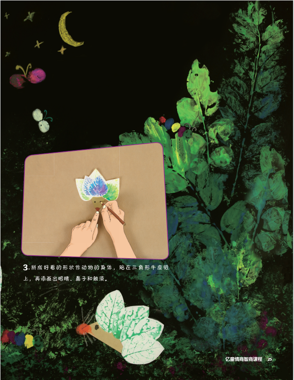 树叶能印出好看的动物,一起来试试吧! 你需要准备: 树叶、水粉颜料、白纸、排刷、剪刀、彩色铅笔、三角形牛皮纸、固体胶棒。 游戏步骤: 1.将树叶刷上颜料并拓印在白纸上。 2.多印几片叶子并剪下来。 3.拼成好看的形状作动物的身体,贴在三角形牛皮纸上,再添画出眼睛、鼻子和触须。