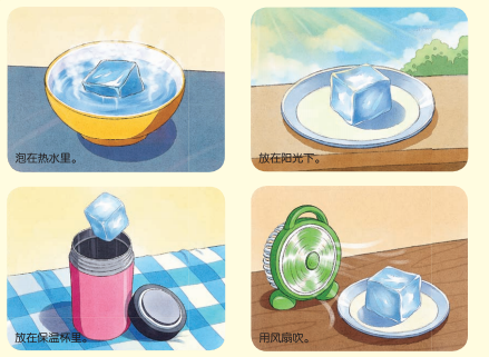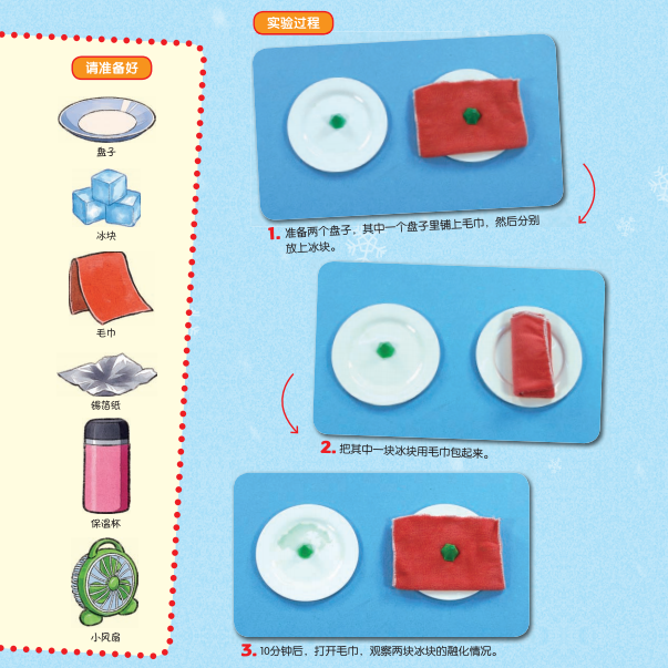 你需要准备: 盘子、冰块、毛巾、锡箔纸、保温杯、小风扇。 实验步骤: 1.准备两个盘子,其中一个盘子里铺上毛巾,然后分别放上冰块。 2.把其中一块冰块用毛巾包起来。 3.约10分钟后,打开毛巾,观察两块冰块的融化情况。 活动思考: 下面哪种情况可以加快冰块的融化速度呢?
