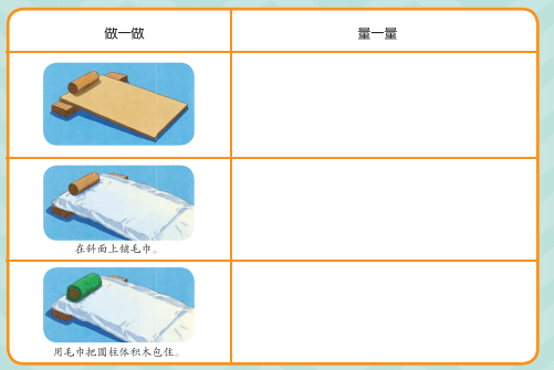 你需要准备: 光滑的硬纸板、积木、毛巾、毛线。 实验步骤: 1.用硬纸板和长方体积木搭一个小斜面,斜面高约2厘米。 2.把圆柱体积木放在斜面顶端。 3.松手,让圆柱体积木自然滚下来。 活动思考: 1.下列哪种情况“车轮”滚得最近,哪种情况滚得最远?