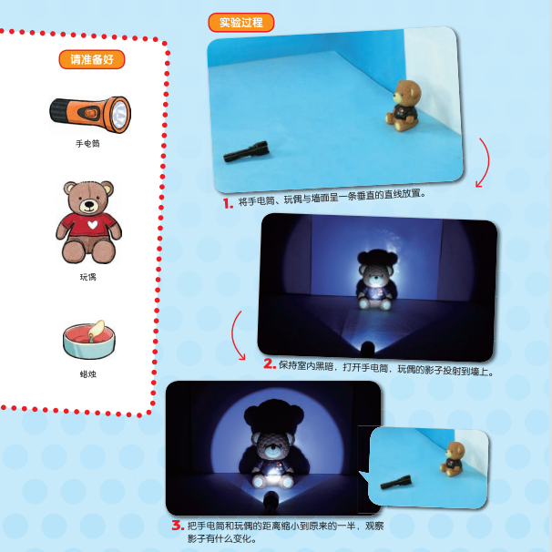 你需要准备: 手电筒、玩偶、蜡烛。 实验步骤: 1.将手电筒、玩偶与墙面呈一条垂直的直线放置。 2.保持室内黑暗,打开手电筒,玩偶的影子投射到墙上。 3.把手电筒和玩偶的距离缩小到原来的一半,观察影子有什么变化。 活动思考: 将手电筒换成蜡烛,影子发生了什么变化?蜡烛逐渐靠近玩偶时,影子又会发生什么变化?