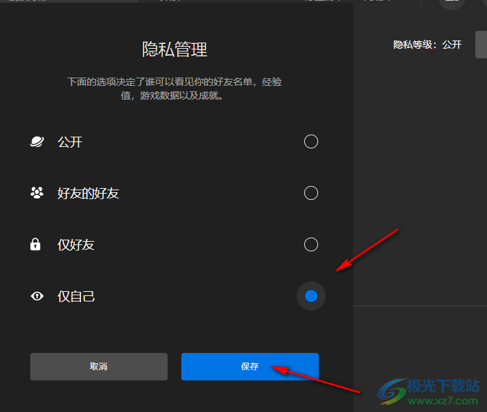 epic是很多小伙伴都在使用的一款游戏平台,它其中有着丰富的游戏资源可供我们选择,每隔一段时间还会有免费游戏可领取,在活动期间,还可以使用优惠券来购买游戏,深受广大用户的喜爱。在使用Epic的过程中,好友之间可以互相查看对方的游戏成就,如果我们不希望自己的成就被别人查看,我们可以进入成就页面,然后点击隐私管理选项,接着在管理页面中将设置更改为“仅自己”即可。有的小伙伴可能不清楚具体的操作方法,接下来小编就来和大家分享一下Epic隐藏自己的成就的方法。 ![]() 1、第一步,我们在电脑中找到Epic软件,点击打开该软件,然后在页面右上角打开自己的头像 ![]() 2、第二步,打开头像图标之后,我们在下拉列表中找到“我的成就”选项,点击打开该选项 ![]() 3、第三步,进入我的成就页面之后,我们在该页面右上角找到“隐私等级”选项,打开该选项右侧的“...”图标 ![]() 4、第四步,打开“...”图标之后,我们在下拉列表中找到“隐私管理”选项,点击打开该选项 ![]() 5、第五步,在隐私管理页面中,我们将隐私设置为“仅自己”,然后点击“保存”选项即可 ![]() 以上就是小编整理总结出的关于Epic隐藏自己的成就的方法,我们在Epic中打开自己的头像,再点击“我的成就”选项,在成就页面中,我们点击右上角的“...”图标,然后在下拉列表中点击“隐私管理”选项,最后在隐私管理页面中将设置更改为“仅自己”即可,感兴趣的小伙伴快去试试吧。 ![]() epic游戏平台(epic games)150.25 MB / v13.0.0 pc官方最新版 下载 |