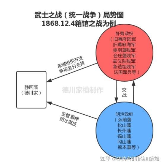 引言: 习惯上,我们常常以“倒幕战争”来简单概括1868-1869年的日本内战(戊辰战争),也将战争中对立的双方简化为“新政府”和“旧幕府”。一般而言这样的概述无可厚非,在交谈和转述时没有问题。然而但不够严谨,在正式的场合下也以上述概述来探讨这场对日本意义重大的战争,这便是犯了学术上的错误,容易误导他人。 因此我在这篇文章中不仅更多的采取幕府侧的视角研究这场决定日本命运的战争,以改变传统的仅从一方视角看待问题——只谈新政府军如何胜而不谈幕府军如何败;并且提出一个新的观点,即“三分戊辰战争”,将戊辰战争分为三个阶段和三方势力来分析。 三个阶段即幕府之战(权力战争)、同盟之战(复仇战争)、武士之战(统一战争),括号外的是以旧幕府方的视角描述战争的主体,括号内的是对萨长新政府建立的日本的影响概括。 三方势力即萨长新政府、旧幕府、奥羽越列藩同盟。需要特别强调的是,这三方势力是一个概括性称呼,并且在战争的三个阶段的名称也不尽相同,将在下文详细体现。 ![]() 一.幕府之战(权力战争) 这一阶段的战争从鸟羽伏见之战爆发开始,到上野之战结束为止。时间是1868年1月27日——1868年7月4日(和历庆应4年1月3日到庆应4年5月15日)。 1. 战争始末 进入1866年,京都局势变得异常紧张,“尊王攘夷派”已从最初的希望借助幕府联合各藩实现攘夷,转变为要以天皇为中心建立新政权,推翻幕府旧制来进而实现攘夷。与之针锋相对的是“公武合体派”,认为以天皇为首的公家和以幕府将军为首的武家在国家危难之时不应该对立,而应该联合,并最终合并行成一个统一的新政府。1867年11月9日,德川庆喜大政奉还,宣布将政权还给朝廷。随后在1868年初,由于朝廷方的猜疑,以岩仓具视为主导的公卿再度发起小御所会议,提出“王政复古”,京都随即被萨长等倒幕藩把持。德川庆喜要率军上洛亲自向天皇叙职。两派的矛盾尖锐不可调和,新政府军在京都近郊的鸟羽、伏见两个地区部署重兵准备阻击上洛的幕府军,鸟羽伏见之战爆发,戊辰战争就此拉开序幕。 所谓幕府之战,是由于此时的主力是幕府军,对阵萨长新政府军队,主体是“旧幕府”的意志,以战争中幕府的独立意志来定义始末;且这是一场决定日本国内局势的战争,一方是萨长两藩建立的新政府要通过战争手段实现“王政复古”,另一方是德川幕府的军队携《讨萨表》上洛要求“清君侧”。获胜者将占据地利把持朝政号令天下,故又称为“权力战争”。若幕府方胜利,则会使德川家的统治再延续一段时间;这段时间很可能会成为幕府改革制度的良好时机,如果德川庆喜等开明派的改革顺利,将可能把日本塑造成我们不可想象,与现在地位、文化截然不同的国家。若新政府军能首战取胜,便可以大获支持,有能力继续推进倒幕战争使推翻旧幕府形成摧枯拉朽之势。 历史的车轮驶向了后者。驻守在鸟羽的萨长军队率先向幕府军开火,战争伊始便陷入了混乱似乎预示着幕府军的结局。新政府的胜利使鸟羽伏见之战后果然其合法地位得到了极大稳固,一些对战局表示观望的藩陆陆续续地加入到了新政府的行列,其中如津藩、鸟取藩、诹访藩等。 鸟羽伏见幕府军的战败之因在前作中已经详细论述,大致有三点,概述即是幕府军未做好充分的作战准备,指挥上出现的重大失误,以及锦之御旗出现后导致的巨大的心理落差。这里不展开介绍,详谈大众关于这场战役的误区。对于鸟羽伏见之战的常见误解存在于两个方面。一是幕府军的准备状况,二是幕府军使用的武器装备。在准备方面,由于禁门之变时向朝廷出兵的长州藩被指认为朝敌,在朝廷权威空前加强的幕末时代,德川庆喜忌惮于向天皇所在的皇宫开火,于是命令部队仅携带少量弹药并在行进时步枪不上膛,以免走火导致不可控的局面。同时幕府军内的一些将领认为只要兵力占有绝对优势的幕府军不率先发难,萨长军队不敢向幕府军主动攻击。在孝明天皇死后,此时的德川庆喜还没有拜见过明治天皇,于是幕府军打出“觐见新皇”寄希望于行军列阵后萨长军队自行让路,德川的军队便可顺利抵达皇宫挽回朝政。然而结果是萨摩藩、长州藩在幕府军上洛沿途布下严密的防卫,并且命令炮兵率先向幕府军的行军队伍展开炮击,导致幕府军顿时陷入混乱,首战失利。随后新政府军举起了岩仓具视伪造的锦之御旗,打击了幕府军的士气,也动摇了德川庆喜的态度。最终导致了德川庆喜率重臣返回江户,幕府军失败撤出鸟羽伏见的战场。 2.伪之锦旗 为什么说锦之御旗是伪造的呢?这是由于在戊辰战争爆发前,倒幕派公卿岩仓具视暗地联系萨长从事倒幕活动,作为朝廷中的一员,他不断以朝廷的名义为萨长的举兵争取合法性,其中锦旗就是这一形势下的产物。传说锦之御旗曾在镰仓时代承久3年的承久之乱中,首次被后鸟羽上皇配发给了讨伐镰仓幕府的队伍,受命为官军。此后几乎再无使用的记载,并且也没有现成的锦旗保存在皇宫内。而岩仓具视为了让萨长藩的军队也成为官军,便根据镰仓时期的传说片段,在甚至不知道历史上锦旗样貌,根据自己的理解命女工缝制了锦之御旗。这面暗地里制作的旗帜,既没有得到朝廷的批准,也没有得到天皇的授意,自然是伪造的了。然而幕府军上下也没有听闻过何为锦旗,在鸟羽伏见之战时萨摩藩士兵一边举旗锦